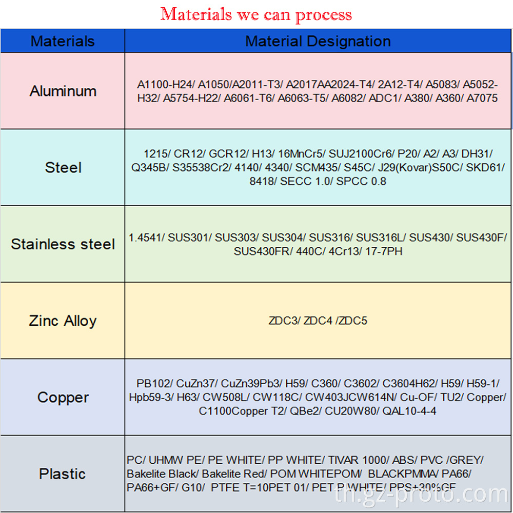 วัสดุที่แปรรูปได้: อลูมิเนียม, ทองเหลือง, บรอนซ์, ทองแดง, โลหะชุบแข็ง, โลหะมีค่า, สแตนเลส, โลหะผสมเหล็ก
